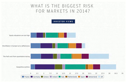 Slower growth in China was the key concern for investors last autumn. This perception, however, has now shifted. According to the study, the geopolitical/political environment is now the key risk for markets for 33% of European investors in 2014.. Other concerns include the Fed's exit from quantitative easing (30%), Europe turning to deflation (21%), and equity valuations being too high (17%).