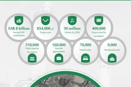 The first phase of the company’s projects will cover an area of 854,000 square meters, delivering 115 buildings of various architectural designs. 70,000 new hotel rooms will enable the site to receive 310,000 visitors per day. In addition, the first phase will see the development of around 9,000 residential units, 360,000 square meters of commercial space and prayer areas designated for more than 400,000 worshipers. The project will take place only 1,430 meters away from the Holy Kaaba.