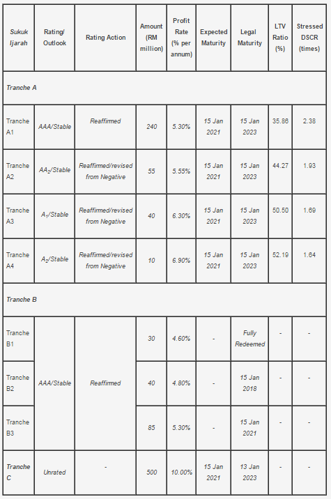 Menara ABS is a trust-owned, special-purpose vehicle incorporated solely for the Sukuk Ijarah agreement involving the Properties. Profit payments on the Tranche A Sukuk are covered by lease payments from TM while the principal redemption will be met via proceeds from either refinancing, repurchase by TM or the disposal of the Properties in the open market. During the reviewed period, TM had promptly settled its RM75.2 million of lease obligations, met its periodic distribution obligation of RM63.6 million on the Tranche A, Tranche B and Tranche C Sukuk, and fulfilled the final distribution of RM11.9 million on the Tranche B Sukuk.