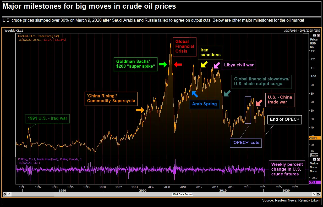 DUBAI, UNITED ARAB EMIRATES - Refinitiv today released a report on the latest development in the Oil market. According to Ranjith Raja, Oil Research Manager, Middle East and North Africa, Refinitiv, the Benchmark crude prices went into a tailspin on Monday morning trade following OPEC and its allies including Russia failing to agree on extending and deepening the output cut which expires at the end of this month. Oil prices closed on Friday with Brent down by 10.4% and WTI down by 7.8% w-o-w. As of 07:30 GMT this morning, Brent crude was at $33.93/MT, down by 25%, the largest single day drop since the Gulf War in 1991, while WTI was down by 26.8% at $30.22/MT. On market opening, prices dropped to an intra-day low of $31.29/MT for Brent and $27.37/MT for WTI.