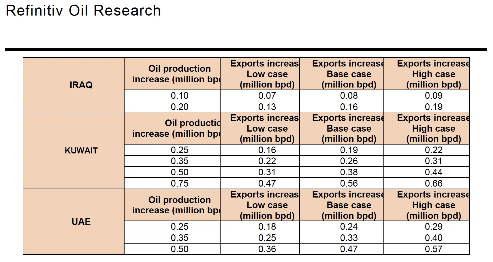 Raja explained that besides Saudi Arabia, all three countries (Iraq, UAE and Kuwait) are the three key exporters from the Middle East who have spare capacity and the potential to ramp up production when the supply cut agreement ends in March. Of these three countries, Iraq has the least spare capacity and has been prone to internal conflicts which reduces the reliability of spare capacity, while Kuwait and the UAE can be expected to ramp up production with a high degree of confidence. It may be noted that Kuwait and Saudi Arabia have also restarted production from the Neutral Zone area in February which is expected to have the potential to reach 500 kbpd by the end of this year and could cater to refineries that have specific demand for heavy sour crude oil. Refinitiv Oil Research has analysed the potential increase in exports that could be added to the market based on three scenarios – (i) Low Case: Lowest exports to production ratio since 2015; (ii) Base Case: Exports to production ratio since 2019; (iii) High Case: Highest exports to production ratio since 2015.