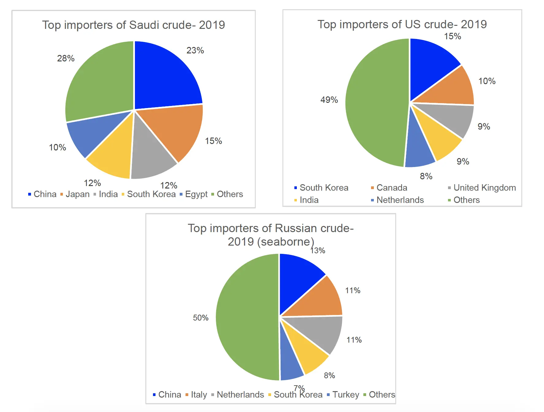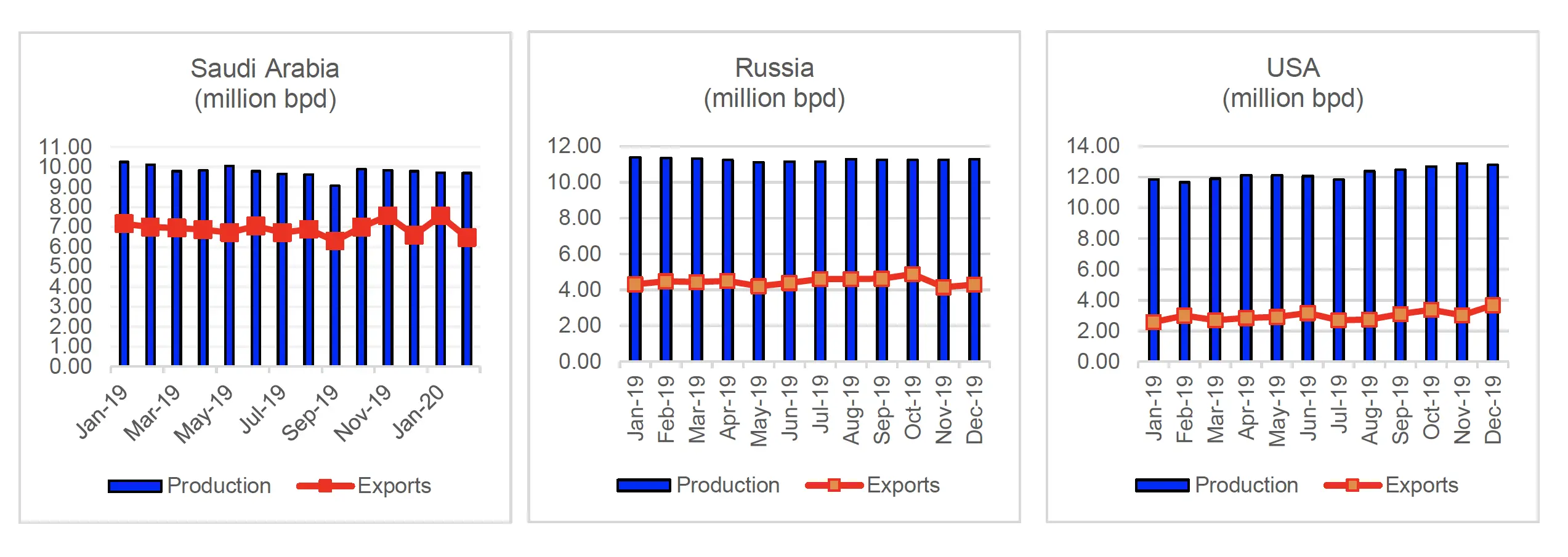 Raja noted that Saudi Arabia, Russia and USA together contribute more than 30% of global oil supply and in terms of exports while Saudi Arabia and Russia have had significant control on the market, USA backed by growing shale oil production has seen a surge in exports. In 2019, USA exported on an average, 24% of every barrel of oil produced. Russia on the other hand exports on an average, 40% of its total crude oil production, while Saudi Arabian seaborne exports have typically ranged around 70% of production although the export ratio since 2015 has ranged from a minimum of 61% to a max of 78% of production volumes.