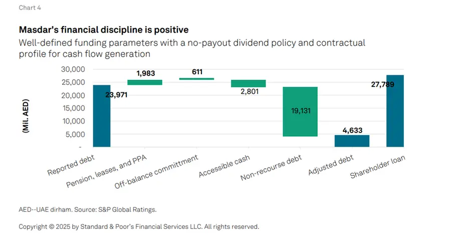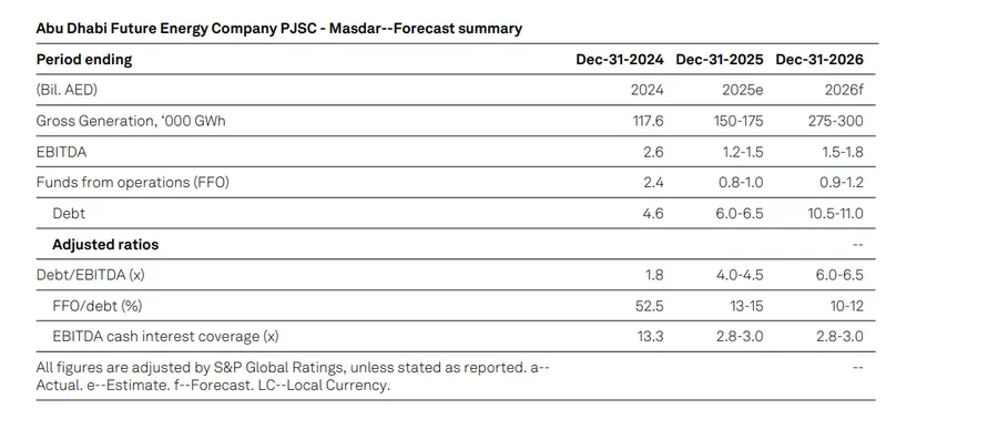 Masdar's strong diversification, government-backed growth model, and hands-off approach to distressed assets all support the deconsolidated financial analysis approach. Unlike many of its peers, Masdar's business model ensures that its financial risk profile is not tied to individual projects or their associated debt. The company's expansion is driven by government capital injections and strategic acquisitions, rather than asset monetization, further limiting its reliance on project-level cash flows. In our assessment of Masdar, we deconsolidate all nonrecourse asset-level debt and cash flows and included the dividend distributions from these projects to calculate its financial metrics. The deconsolidation is not merely because of the nonrecourse nature of the assets, but because we believe Masdar's approach to individual projects in the context of its large portfolio, in terms of business strategy, governance and influence, allows us to do so. We estimate Masdar's leverage (i.e., mostly corporate debt at the parent level) will remain high over the next two years. Masdar's deconsolidated debt-to-EBITDA is likely to increase to 5.0x-6.0x over 2025 and 2026, from 1.8x in 2024, before falling to 2024 levels as all the development activity Masdar has undertaken over the past year--particularly through the acquisitions of growth platforms--become operational and begin generating cash.