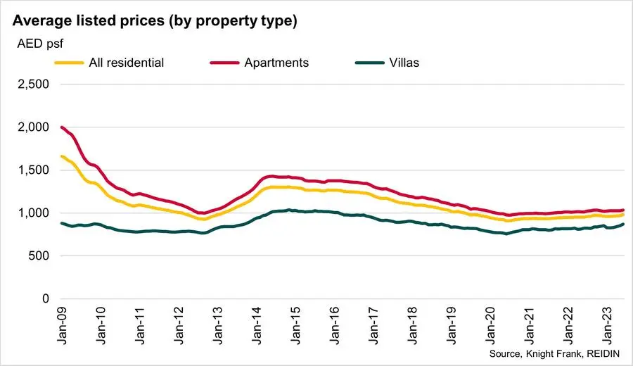 When segmenting by property types, villas (AED 871 psf) are now 16.1% more affordable than 2014 levels, compared to apartments (AED 1,035 psf) which trail the last market high by 27.2%.