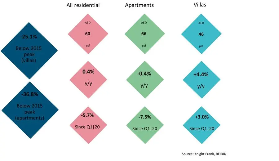 For the city, average annual residential lease rates stand at AED 60 psf, a 0.4% rise from this time last year, according to Knight Frank.