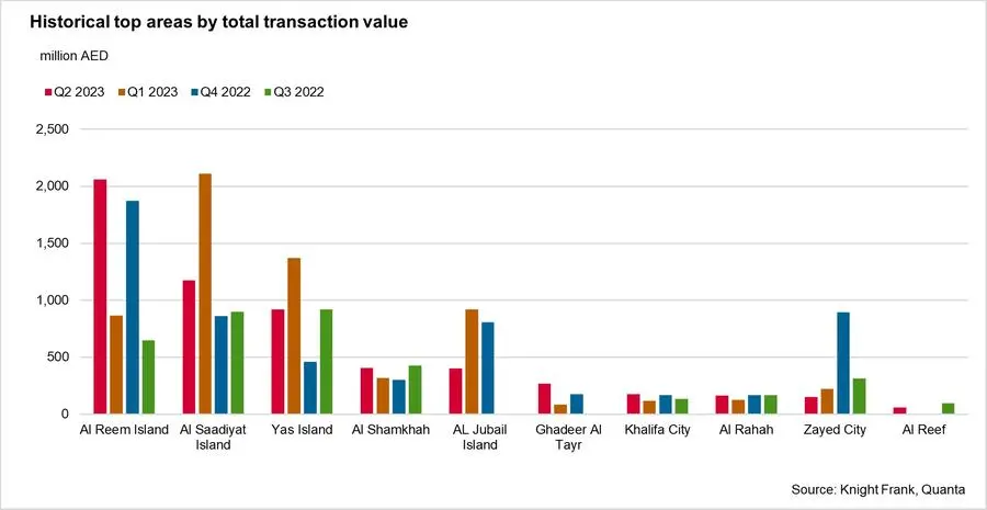 During Q2 2023, Al Reem Island emerged as Abu Dhabi's most active submarket for sales, recording AED 2.1 billion in deals through a total of 816 sales transactions, with villas accounting for 76% and apartments making up 24% of the total. Saadiyat Island followed in second place at AED 1.2 billion, apartments here dominating the sales at 68%. Yas Island ranked third at AED 919 million with villas leading the sales at 65%. The total value of transactions across Abu Dhabi increased substantially to AED 6.1 billion, representing a growth of 103% compared to the same period last year.