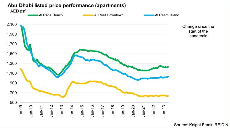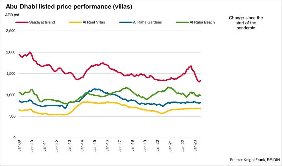 Notably, the growth in villa prices is more pronounced in the low to mid-tier segment of the market, particularly at Al Reef Villas (AED 686 psf) and Al Raha Gardens (AED 826 psf), experiencing price growth of 16.9% and 4.9%, respectively, since January 2020, in contrast to a 0.8% decline at Saadiyat Island (AED 1,337 psf).