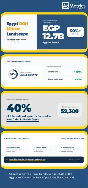 CAIRO, EGYPT — Egypt’s Out-of-Home (OOH) advertising expenditure surged by 60 percent in 2025 to reach EGP 12.7 billion, according to AdMazad’s sixth Annual State of the Outdoor Advertising Market Report. Findings from AdMetrics, Egypt’s leading platform for measuring and analyzing outdoor advertising performance, reveal a clear shift in market leadership from real estate dominance toward what is described as a “brand economy,” driven by a strategic partnership between high-ticket manufacturers and the financial services sector.