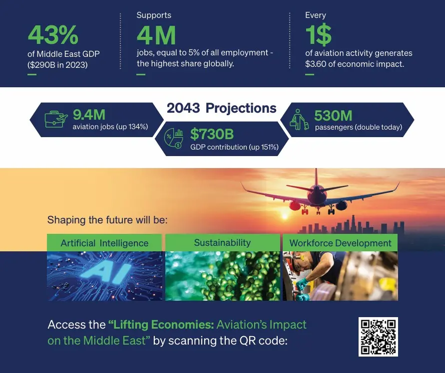 The report titled, "Lifting Economies: The Impact of the Aviation Sector on Middle Eastern Economies," reveals that aviation's contribution to regional GDP will surge by more than 150% by 2043, reaching $730 billion and cementing the industry's position as a key driver of economic development across the region. More than 530 million passengers, twice the current number, are projected to travel through the region, with a 3.9% annual traffic growth rate.