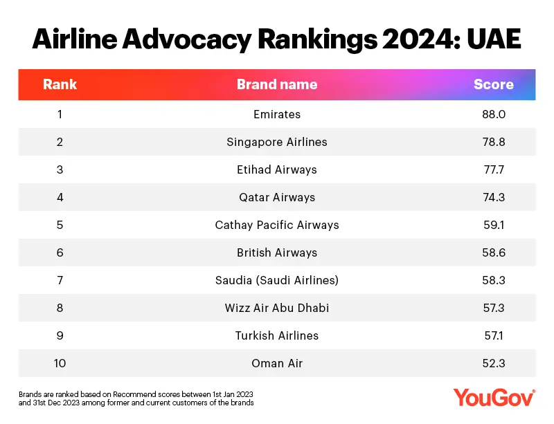 YouGov also revealed the top ten airline brands most recommended by its customers. In the Airline Advocacy Rankings, Emirates tops the list, with a score of 88.0. Singapore Airlines (78.8) and Etihad Airways (77.7) follow in second and third, respectively.