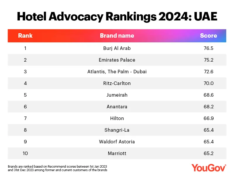 Burj Al Arab tops YouGov’s Hotel Advocacy Rankings 2024 in UAE, with a score of 76.5.