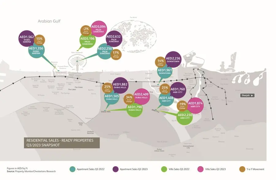 The biggest hike for both villas and apartments was at Dubai Hills, with villas averaging AED2,409 per square foot – more than a third higher than in Q3 2022 and 9 per cent up on Q2 2023. Apartments in Dubai Hills cost an average of AED1,882 a sq ft in Q3 this year, an increase of 25 per cent from 2022, and a 6 per cent jump compared to April – June this year.
