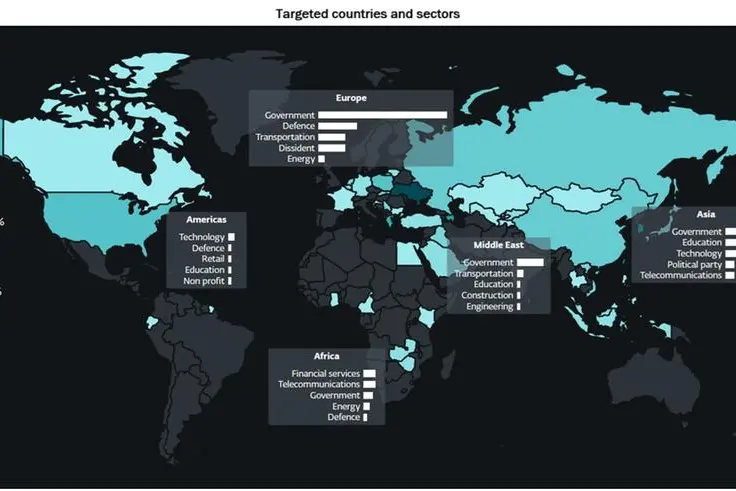 Iran-aligned groups, on the other hand, compromised several financial services firms in Africa – a continent geopolitically important to Iran, conducted cyberespionage against Iraq and Azerbaijan, neighboring countries with which Iran has complex relationships, and increased their stake in the transport sector in Israel. Despite this seemingly narrow geographical targeting, Iran-aligned groups maintained a global focus, further pursuing diplomatic envoys in France and educational organizations in the United States.