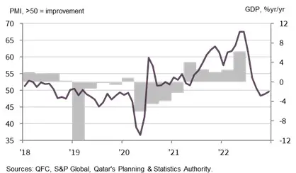 The headline Qatar Financial Centre PMI is a composite single-figure indicator of non-energy private sector performance. It is derived from indicators for new orders, output, employment, suppliers’ delivery times and stocks of purchases. The PMI rose for the second month running from 48.8 in November to 49.6 in December, pointing to a near-stabilisation in overall non-energy private sector business conditions at the end of 2022. As was the case in November, a rapid rise in activity – the Output Index posted 62.8 on the back of surging retail trade and services – was countered by a construction-driven pause in new work, as well as improving supply chains.