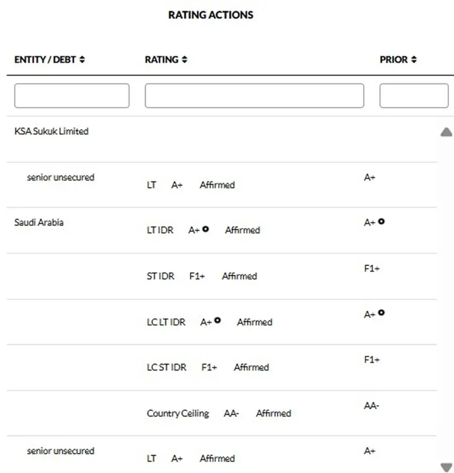 Fitch Ratings - London - Fitch Ratings has affirmed Saudi Arabia's Long-Term Foreign-Currency (LTFC) Issuer Default Rating (IDR) at 'A+' with a Stable Outlook.