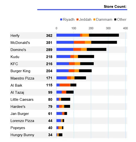 The bi-annual report monitored 15 brands in nearly 2,300 locations across Saudi Arabia, revealing that Herfy holds the most prominent store network with over 362 locations. Herfy also has at least one store in most of the cities with a population exceeding 100,000 residents. Additionally, they claim a substantial presence in the 34 cities with a population of over 500,000 residents.