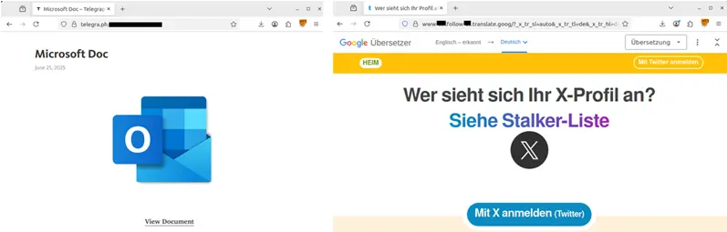 and an example of a phishing page hidden behind a URL provided by Google Translate (right)