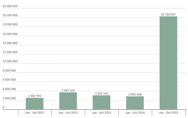 Kaspersky Security Network (KSN) shows that from January through October 2025, the company blocked 6,394,854 phishing attempts impersonating online stores, banks, and payment systems, with 48.2% targeting online shoppers. Over the same period, Kaspersky identified more than 20 million attempted attacks on gaming platforms, including 18.56 million abusing Discord.