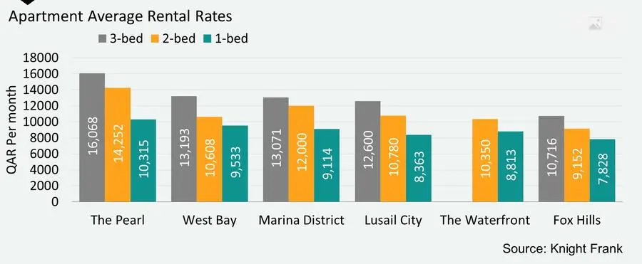 With rents dropping in majority of the districts, Lusail’s Waterfront and Fox Hills districts experienced the highest quarterly depreciation of 23% and 18%, respectively, in the average quoted rents for apartments.