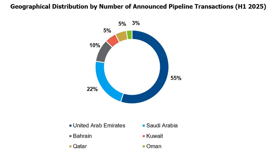 By the end of H1 2025, there were a total of 40 announced transactions in the pipeline, marking a substantial reduction compared to the preceding year when the pipeline saw a total of 55 announced transactions. The majority of these transactions involved United Arab Emirates targets, who accounted for 55% of the total number of announced deals, followed by Saudi Arabia and Bahrain at 23% and 10%, respectively. The remaining transactions involved Kuwaiti, Qatari, and Omani targets. All regions witnessed zero to negative growth in H1 2025 compared to the prior year.