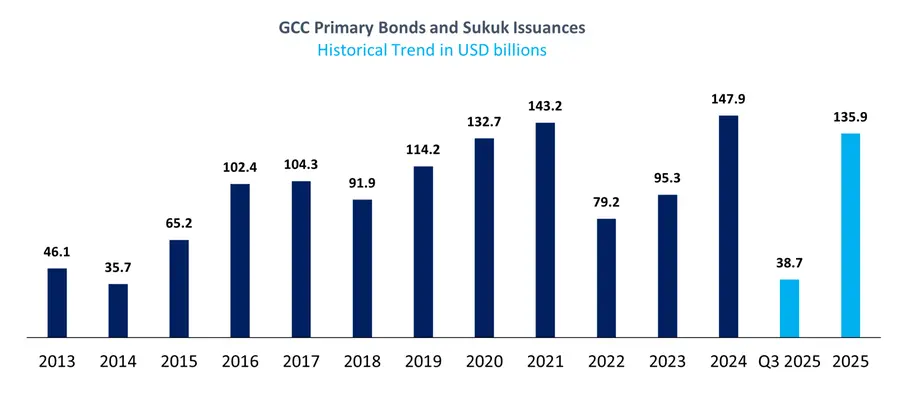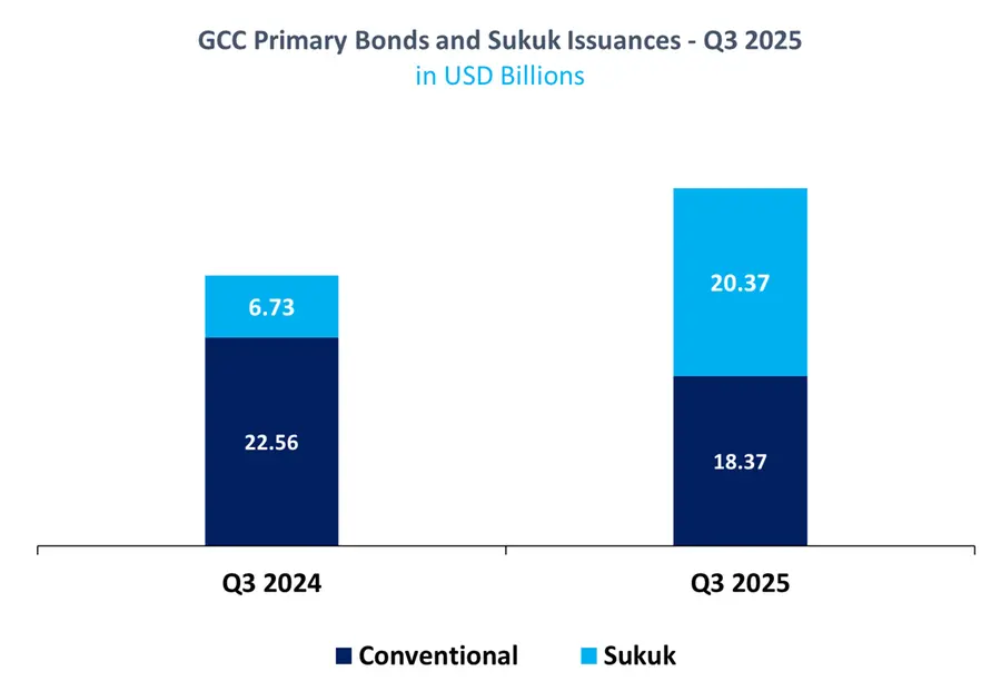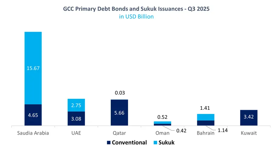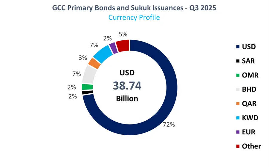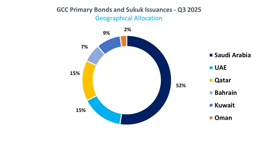 Kuwait: In its Fixed Income Report, Kuwait Financial Centre “Markaz” states that primary debt issuances of Bonds and Sukuk in the Gulf Cooperation Council (“GCC”) Countries amounted to USD 38.74 billion through 137 issuances during Q3 2025, a 32.28% increase from the same period last year, where issuances in Q3 2024 amounted to USD 29.29 billion.