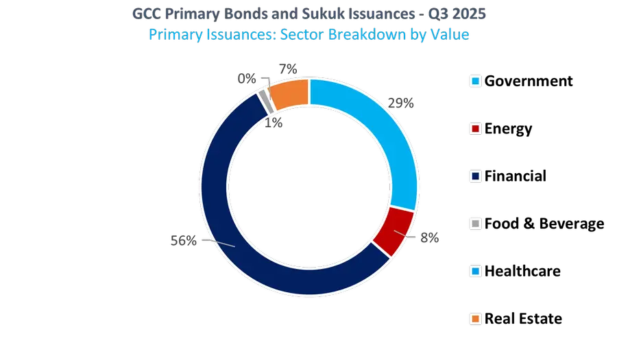 Sector Segmentation: The Financial sector led the bond and sukuk issuances in Q3 2025, with total value of USD 21.53 billion through 113 issuances representing 55.6% of total issuances. Government issuances follow, with USD 11.1 billion through 15 issuances, representing 28.7% of total issuances. This represents an increase for both the financial sector (115.3%) and for government issuances (199.0%) when compared to the same period last year. The energy sector follows, with USD 3.0 billion through 2 issuances, representing 7.7% of total issuances, with the remaining sectors together representing a small portion of total issuance (8.0%).