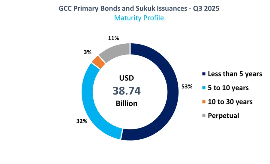 Maturity Profile: In Q3 2025, primary issuances with less than 5-year tenors represented 53.1% of GCC debt capital markets with a total value amounting to USD 20.6 billion through 100 issuances. Primary issuances with 5–10-year tenors followed, raising USD 12.5 billion through 26 issuances, representing 32.2% of total issuances. Primary issuances with 10–30-year tenors represented 3.3% of GCC debt capital markets with a total value of USD 1.3 billion through 3 issuances during the year. No issuances came in with a maturity greater than (“GT”) 30 years, while perpetual issuances saw an increase in both the size and number of issuances when compared to Q3 2024, with a total value of USD 4.4 billion through 8 issuances.