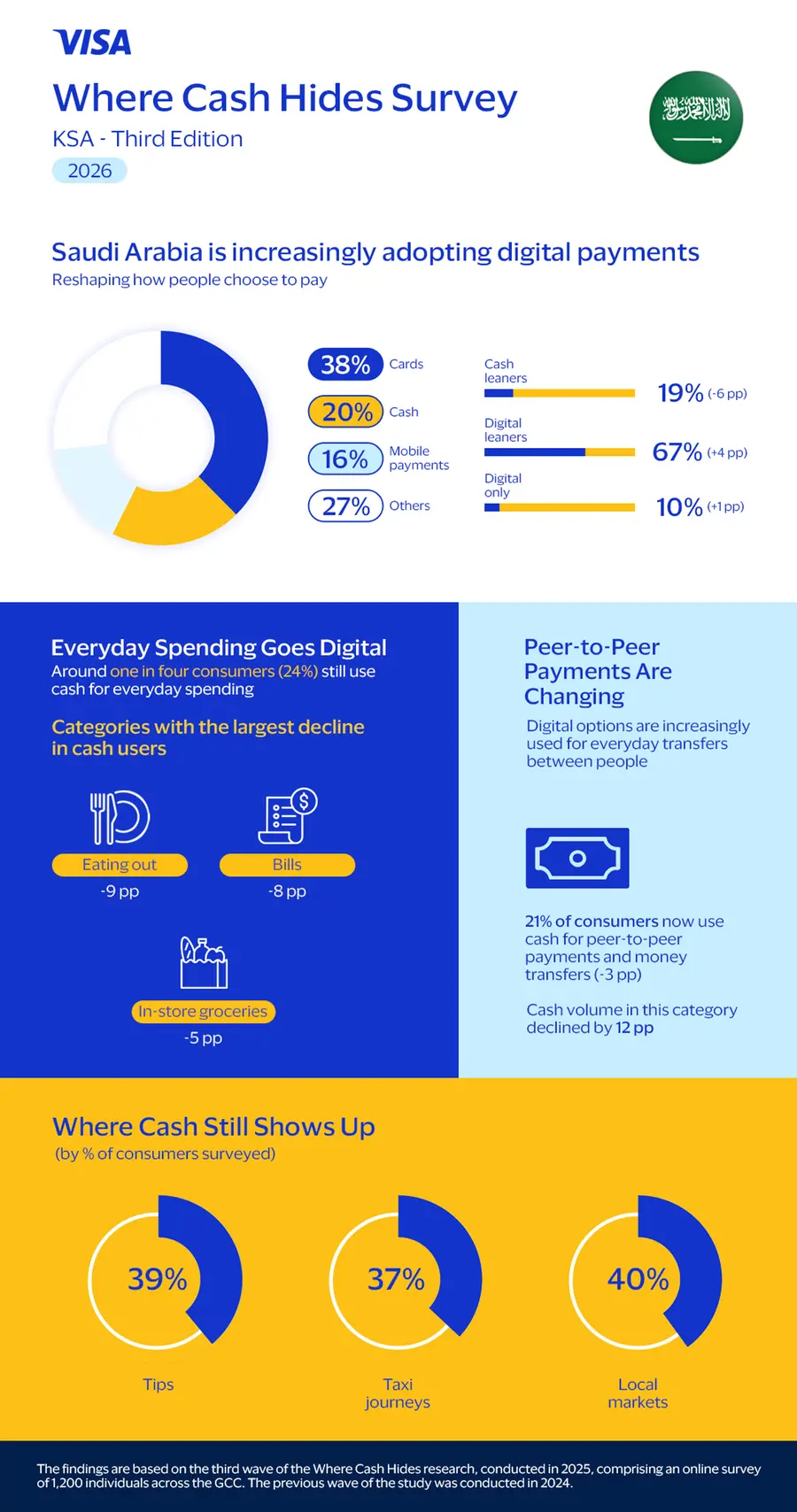 Riyadh, Saudi Arabia: Digital payments are continuing to reshape how people choose to pay in Saudi Arabia, with more consumers embracing faster, more secure digital experiences. Visa’s third edition of ‘Where Cash Hides’ report[1] shows 67% of KSA consumers are largely non-cash users, making most of their payments with payments cards or mobile devices. This is an increase of 4% compared with last year, highlighting a clear move away from cash.