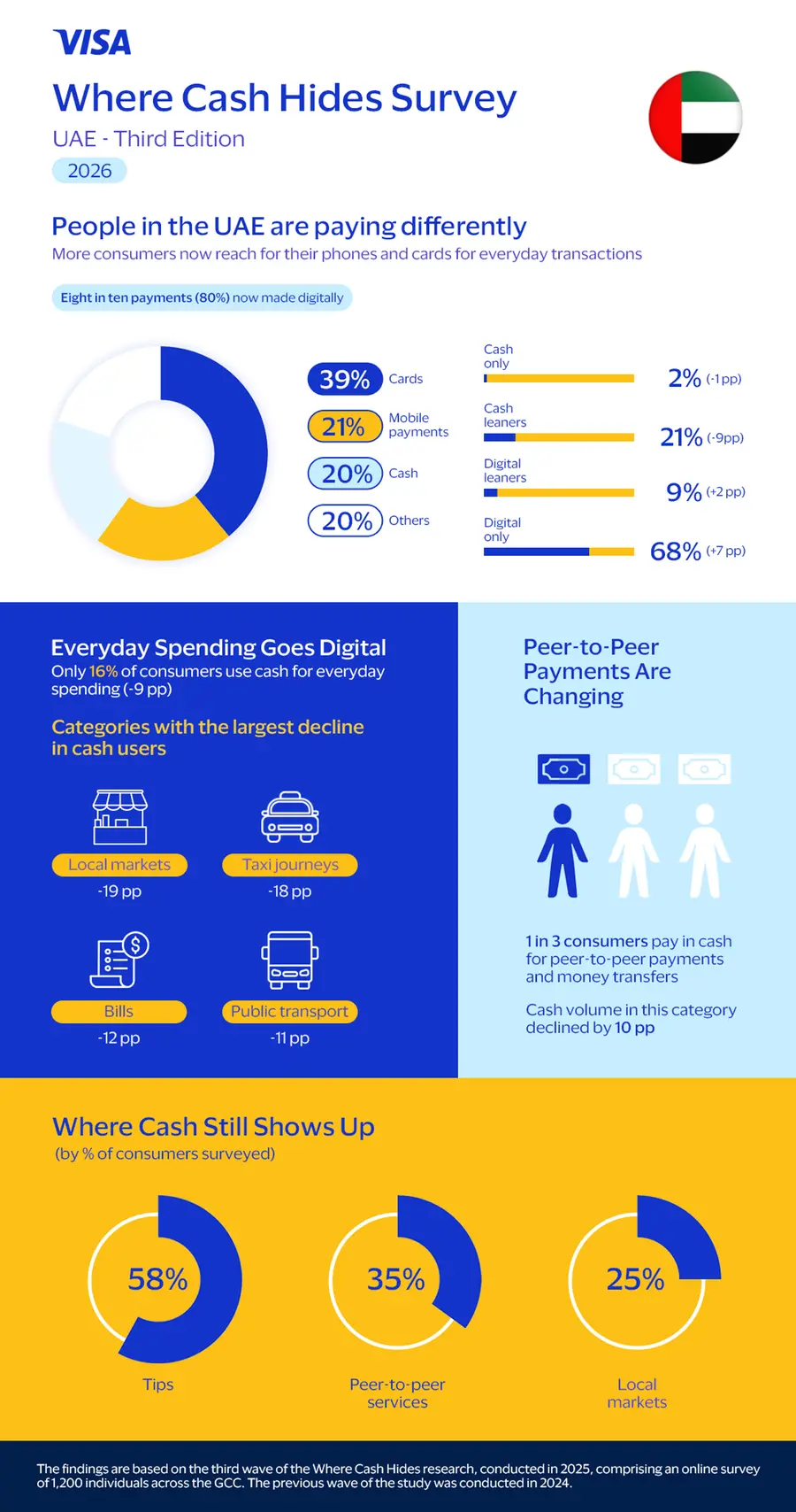 Dubai, UAE: Across the UAE, payment habits continue to rapidly evolve, with more consumers embracing faster, more secure digital experiences. Visa’s third edition of its ‘Where Cash Hides’ report[1] shows 68% of UAE consumers are largely non-cash users, making most of their payments with payments cards or mobile devices. This is an increase of 7% compared with last year, highlighting a clear move away from relying on cash.