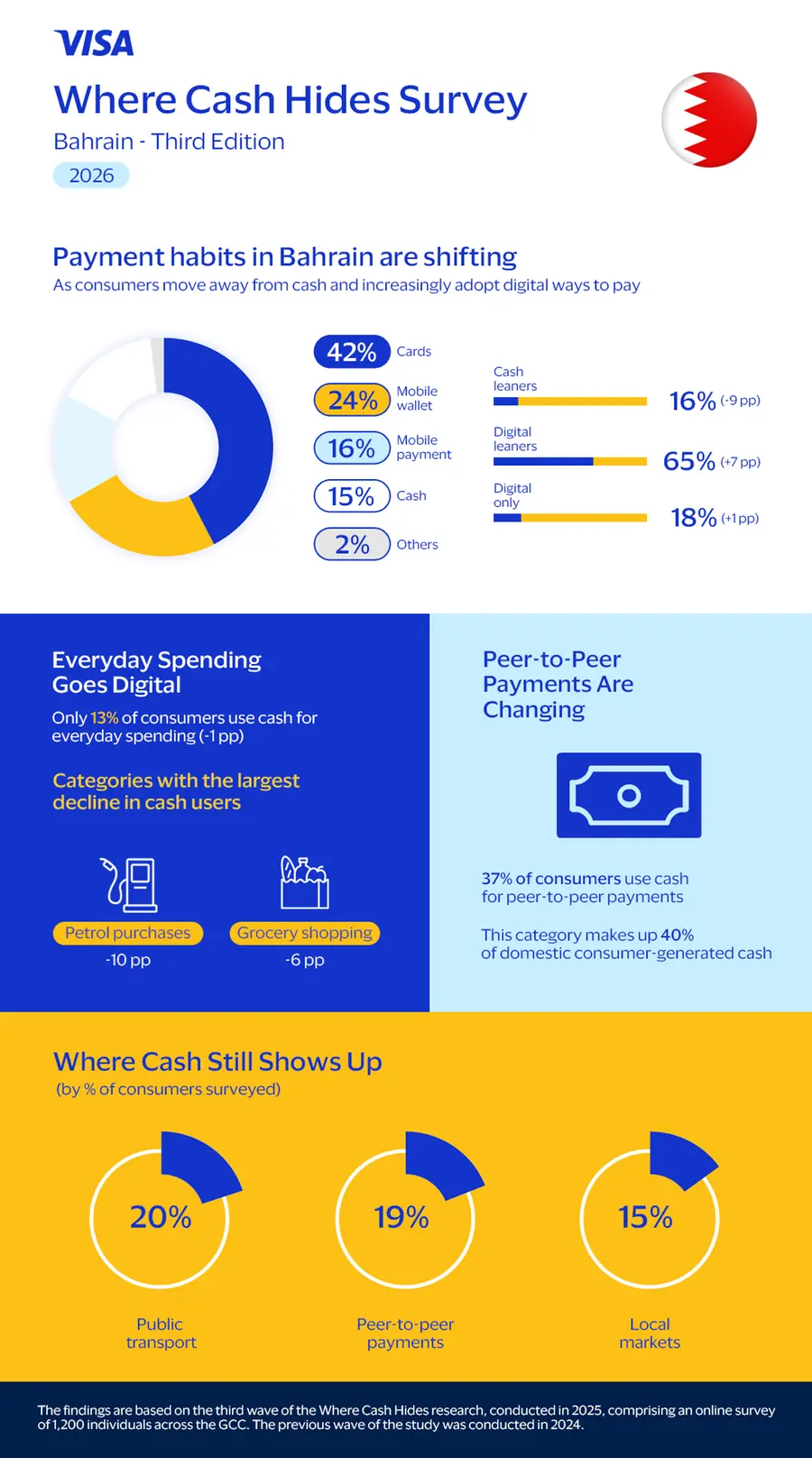 Manama, Bahrain: Across Bahrain, payment habits continue to rapidly evolve, with more consumers embracing faster, more secure digital experiences. Visa’s ‘Where Cash Hides’ report[1] shows 65% of Bahrain consumers are largely non-cash users, making most of their payments with payments cards or mobile devices. This is an increase of 7% compared with last year, highlighting a clear move away from cash.