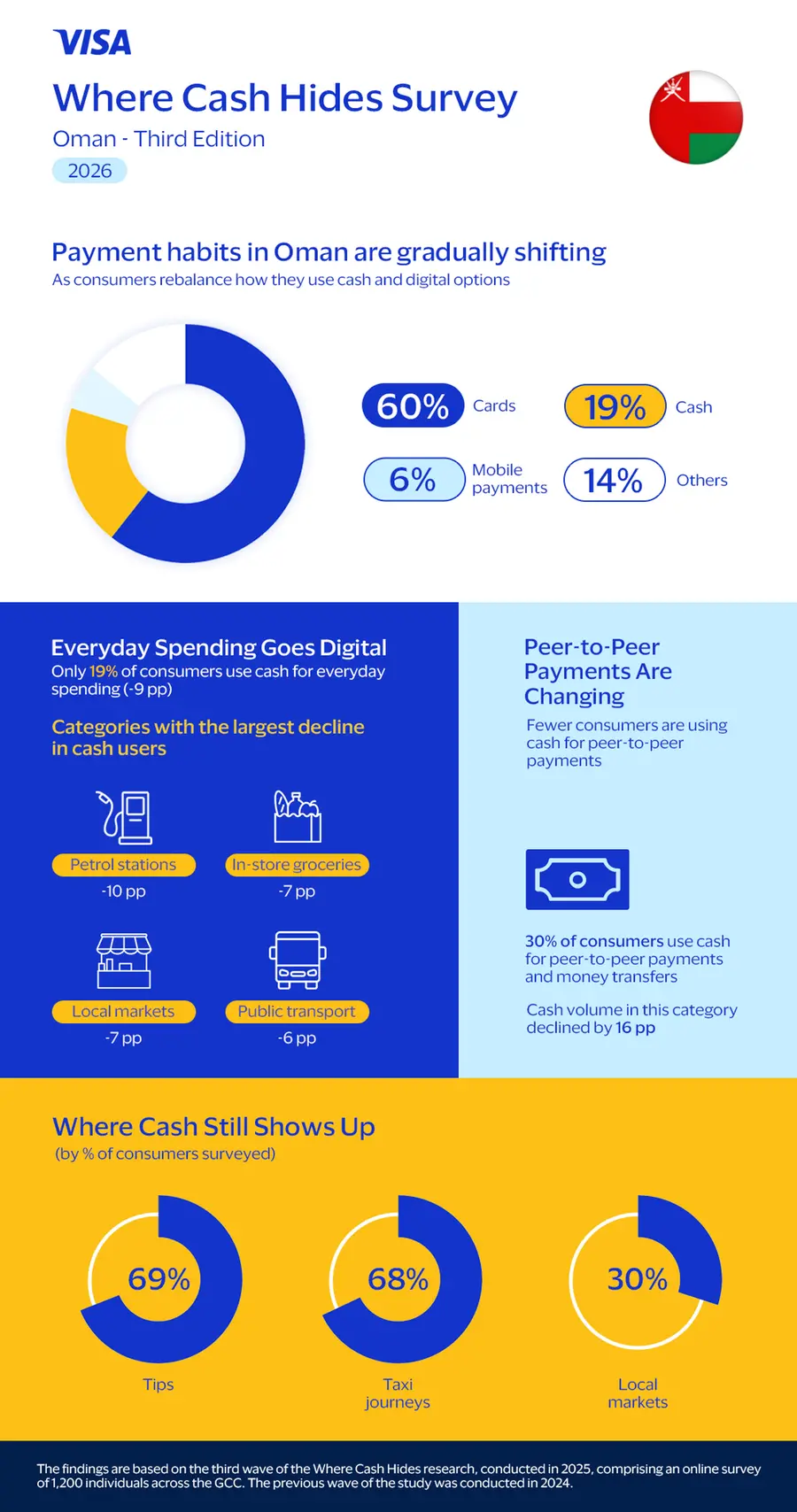 The findings of Visa’s Where Cash Hides research suggest Oman consumers’ growing reliance on digital payments because they are more convenient, secure and rewarding. Compared to cash, debit and credit cards offer consumers greater security, convenience, and transparency. They eliminate the risks of carrying physical money, enable seamless online and in-store purchases, and provide instant transaction records for better budgeting. Mobile payments offer enhanced convenience and security through tokenization, which replaces sensitive card details with unique digital identifiers so the actual card number is never shared.