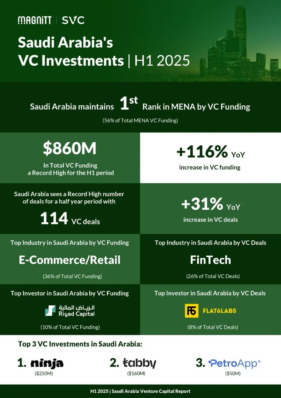 The report released today by the venture data platform MAGNiTT, sponsored by SVC, also shows that Saudi Arabia achieved a record 114 VC deals in H1 2025, a 31% increase compared to H1 2024. This accounts for 37% of the total deals in the MENA region, marking the highest share ever for the Kingdom.