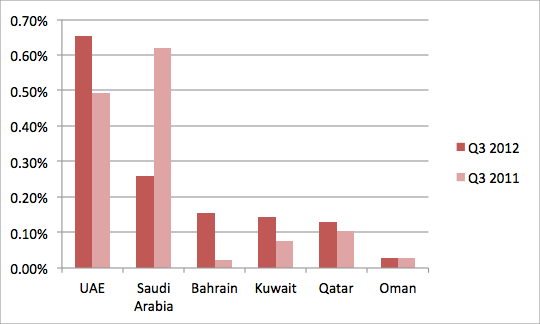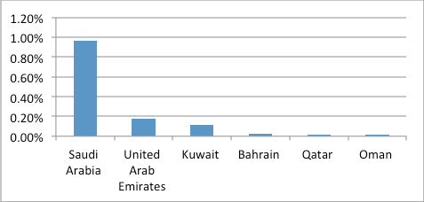 All the GCC countries combined account for only 1.29% of all global spam. The main reason that there are such low volumes of spam originating in the region is due to the relatively low number of users. It becomes even clearer when we look at the following diagram: