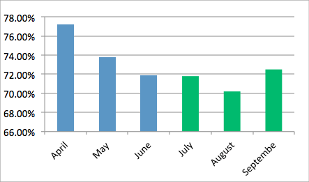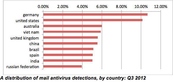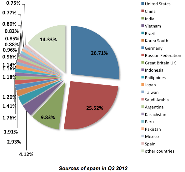 The share of spam in mail traffic differs slightly from country to country. In the third quarter of 2012 the global average fell 2.8 percentage points compared to Q2 and averaged 71.5%.