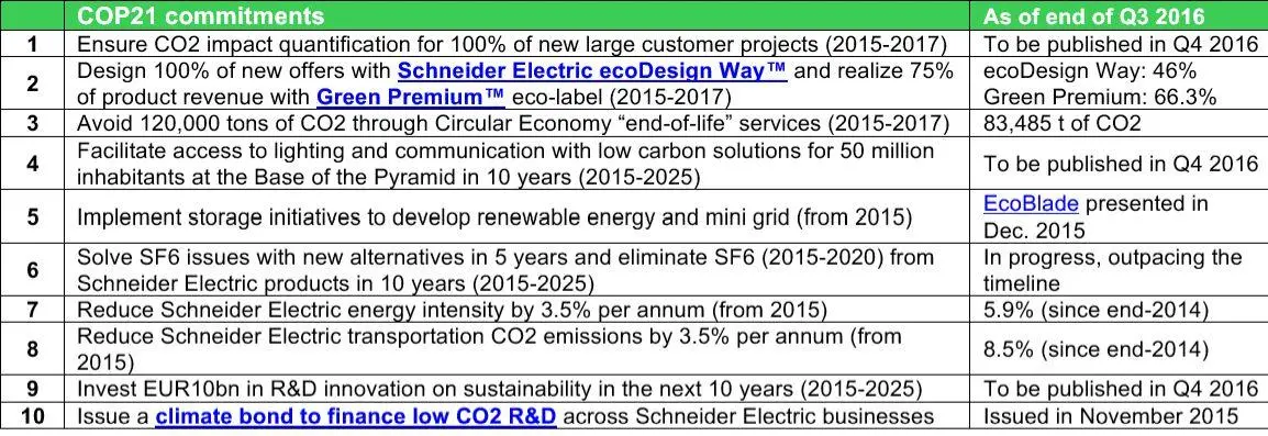 As part of its efforts to advocate energy efficiency, on the eve of the COP21, Schneider Electric stepped up its sustainable development objectives with the goal of achieving carbon neutrality for the company and its ecosystem over the next 15 years, through its products, solutions, R&D and industrial operations. One year later, the Group issued a progress report of its achievements with regard to the 10 commitments: