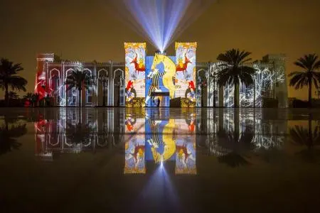 Magnificent towers of lights illuminate an important icon of Sharjah’s architecture - the Dr. Sultan Bin Mohammed Al Qasimi Centre, under the theme ‘Monoliths Landing in Sharjah’ in an astonishing opening show, an illuminated story through time eulogizing the development of Arab heritage, history, culture and their affinity to time and space through the ages. The interplay between colors, light and dark will be a constant invitation to stroll and discover the richness of the architectural details. The structural splendors of the building stand out with the most advanced of light technology in a video mapping show that will awe all who experience it.