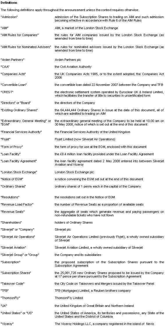 Silverjet announces today that on 2 May 2008 it entered into both a Subscription Agreement and a Loan Facility Agreement with Viceroy, an international luxury development fund based in the UAE and USA that has been investing in the United States since 1997 and elsewhere since 2005.