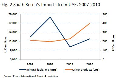 UAE supplies about 10% of South Korea's imports of Petroleum oil and products. With oil prices reaching peak levels in 2008, Korea's imports of the oil products from the UAE reached USD 19 billion, accounting for 99% of its total imports from the country (Fig.2).