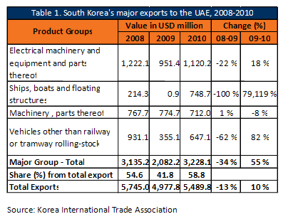 Meanwhile, South Korea's exports to the UAE expanded significantly in recent years. In 2010, the UAE was ranked as its 19th largest export market in the world and the largest in the Middle East.