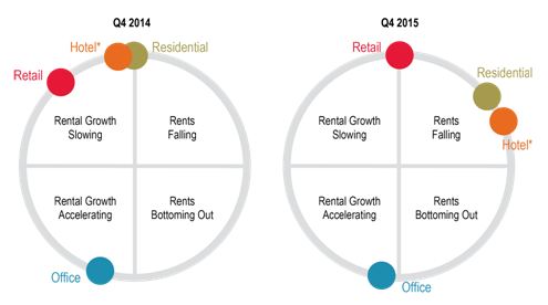 · Residential Rentals: David Dudley commented: "The residential rental market grew at a slower pace than sales growth during the last upswing - with prime average rents growing at 17% during 2013 and 11% during 2014, driven by demand growth outstripping supply, the removal of the rent cap and government policy changes. The slowdown in demand during 2015, balanced with a slow-down in supply completions led to a reduction in rental growth - with prime rents increasing 4% in the first quarter of 2015 and remaining stable for the rest of the year. Vacancy rates remain low in high quality schemes and with limited new quality supply, we expect prime rents to generally be upheld."