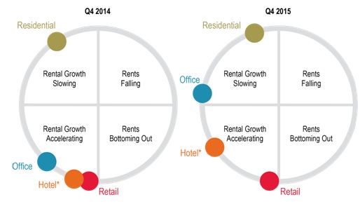 This diagram illustrates where JLL estimates each prime market is within its individual rental cycle at the end of the relevant quarter.