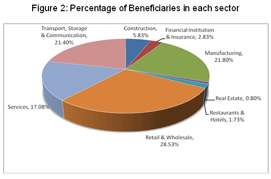 each sector; see Figure 2, most Beneficiaries come from the Retail & Wholesale, Manufacturing, Transport, Storage and Communication Sectors. In addition, having signed with a number of security companies from the Service sector and few others the latter sector is now have a reasonable share in the programme.