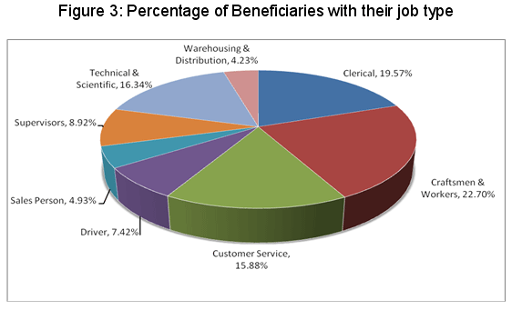 A wide spectrum of jobs held by the Beneficiaries was observed on the programme. Most of these included Craftsmen workers; such as: security guards, drivers, helpers, Clerical: such as those with office based jobs including account clerks and secretaries. Also, technical works such as Accountants, HR officers, welders and mechanics; see Figure 3 below.