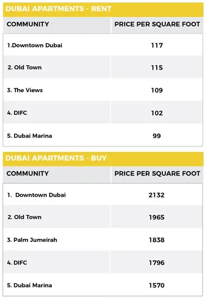 Even with real estate prices dropping across the country, luxury living still comes at a premium. The median price to rent an apartment in Dubai is AED 89 per square foot. By contrast, Downtown Dubai (AED 117 per sq ft), the most expensive neighborhood to rent, is a whopping 31% more costly than the emirate’s median.