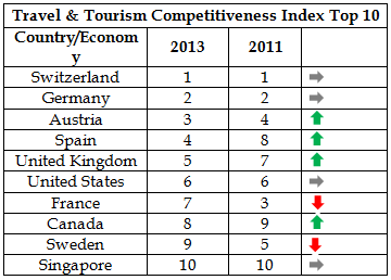 The biennial report, published under the theme, Reducing Barriers to Economic Growth and Job Creation, sees considerable movement in the Travel & Tourism Competitiveness Index's top 10 countries. France fell four places from third in 2011 to seventh, while Spain climbed to fourth from eighth. Also showing strong improvement were the United Kingdom - up two places to fifth - and Canada, up one place to eighth.