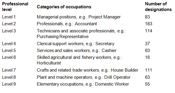 The new Emirati Vocational Classification scheme is a list of 725 occupations (the previous system comprised of 3000 professions) that are now used in the recruitment of workers in the private sector. It was rolled out in September 2018, affecting the employees in the Emirate of Umm Al Quwain; it appears that the system is now applicable in all seven emirates.The new scheme comprises of nine professional levels (those currently affected by the new process are highlighted in red ink):