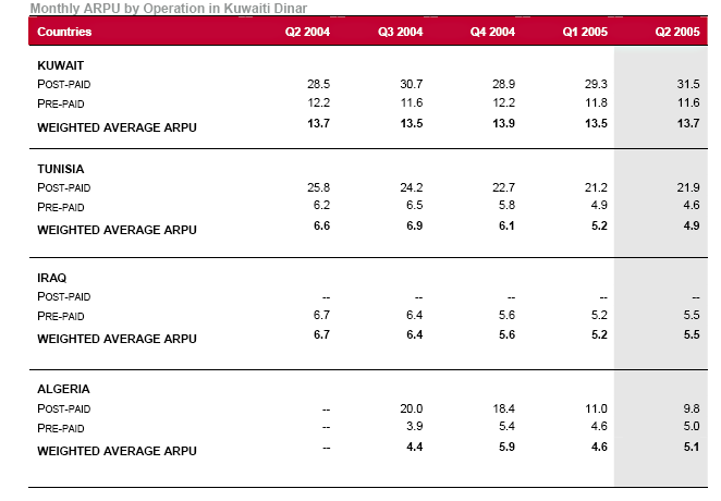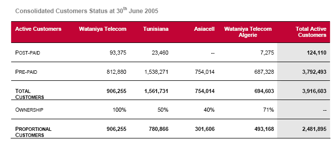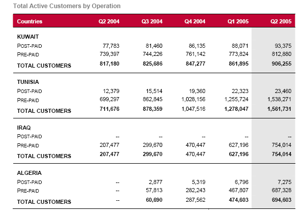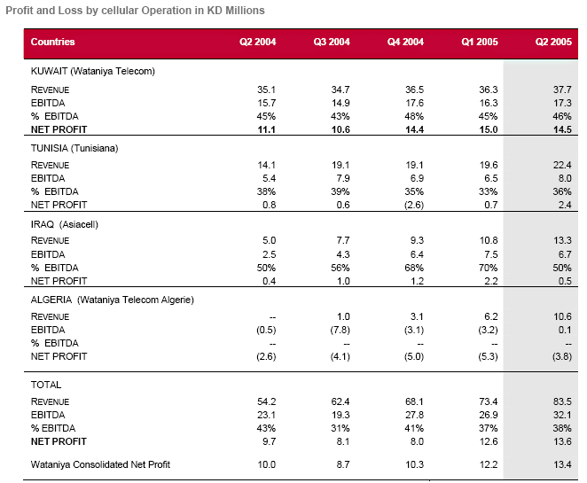 Iraq: Asiacell finalized its network for launch of service in Baghdad with the objective of expanding into southern Iraq. Asiacell achieved an active customer base of over 754,014, an increase of 20% over the previous quarter. Revenues for the 2nd quarter of 2005 were KD 13.3 million (USD 45.3 million) compared to KD 5.0 million (USD 17.0 million) for the 2nd quarter 2004. EBITDA was KD 6.7 million (USD 22.8 million), versus KD 2.5 million (USD 8.5 million) in the 2nd quarter 2004. The net attributable profit to Wataniya Telecom from Asia-Cell in Q2 is KD 0.2 million (USD 0.7 million).