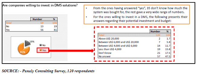 One key finding uncovered by the survey is that a significant number of companies in the GCC plan to increase their spending on effective document management solutions: Eighty one percent (81%) of the survey respondents said that their organization's document management budget will increase while nineteen percent (19%) said it would remain the same. Organizations are finding that document management solutions lower the cost of storing and managing the growing piles of paper-based records while improving document retrieval and disaster recovery capabilities.