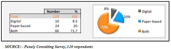 The study revealed that only eight percent (8%) of businesses manage their documents digitally while seventy two percent (72%) manage their documents both digitally and paper based. Furthermore fifty six percent (56%) of the respondents' said that they print more than 50 pages a day, while twenty eight percent (28%) stated that they required to print more than 150 pages a day for office use. In order to stay competitive, executives assert that they are utilizing document management processes like document imaging, which helps improve regulatory compliance and reduce costs and physical space required for paper-based records.