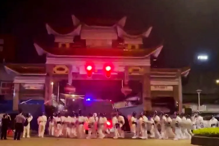 In one video posted on Twitter, dozens of riot police in all-white pandemic gear, holding shields over their heads, advanced in formation over what appeared to be torn down lockdown barriers as objects fly at them.